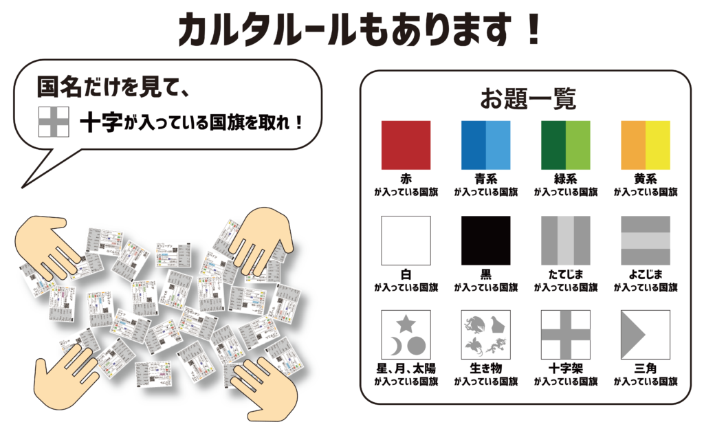みんなでワイワイ遊びながら、世界の国と国旗を覚えられるカードゲームです。